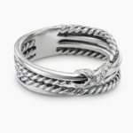 This David Yurman X Crossover Band Ring delivers understated luxury with unmistakable brand DNA. Crafted in solid sterling silver, the iconic crossover design is elevated with pavé-set diamonds totaling 0.05 carat weight, adding subtle brilliance without overpowering the design.